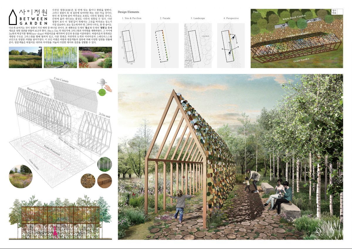 본 계획안은 두개의 '장소'와 두개의 '정원'을 통해 새로운 경관을 만들어 보고자 한다. 그라스원과 자작원을 계획하고, 그 사이에 파빌리온을 배치하여 공간과 동선을 이분하였다. 파빌리온의 한쪽 면은 개방된 구조로 그라스원을 향해 열려져 있고, 다른 한 면은 자연색의 도색과 미러 마감의 스테인리스스틸 코인으로 덮어주었다.