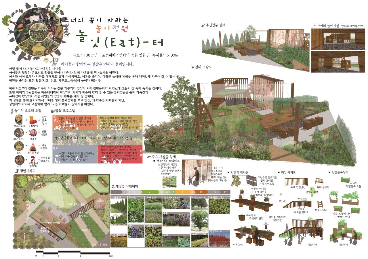 작품명 리틀가드너의 꿈이 자라는 놀이정원 「놀잇(Eat)-터」 작가명 강효정, 김범진 작품소개 어른과 아이가 함께 어울리며 리틀가드너의 꿈을 심어주는 놀이 정원. 일상이 놀이인 아이들을 위해 아이로 하여금 정원을 즐기며 놀 수 있는 일상의 공간을 제공한다. 작가소개 강효정 2013~현재 강산어소시에이트 재직 김범진 2015~현재 (주)동해종합기술공사 재직 작품설명 어른과 아이가 함께 어울리며 리틀가드너의 꿈을 심어주는 놀이 정원. 일상이 놀이인 아이들을 위해 아이로 하여금 정원을 즐기며 놀 수 있는 일상의 공간을 제공한다. 작품조성과정 조성과정 최종완성 작품판넬