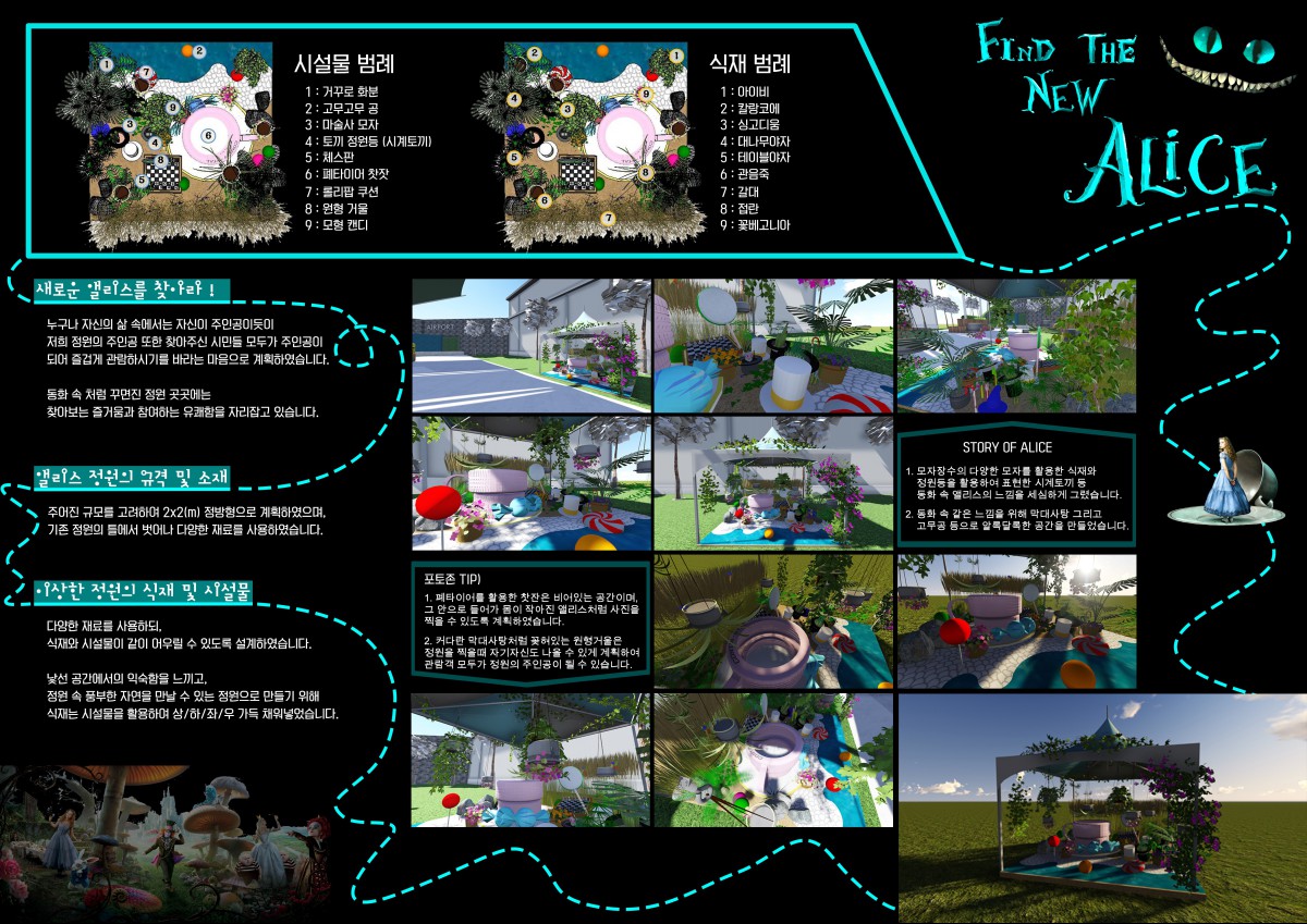 동화 속 이상한나라를 모티브로 꾸며진 정원 곳곳에는 ‘찾아보는 즐거움’과 ‘참여하는 유쾌함’을 동시에 느끼실 수 있습니다. 모자장수와 시계를 보는 토끼 등을 상징하는 화분과 정원을 배치하였고, 그 외에도 독특한 식재와 시설물을 활용하여 다양하게 표현하였습니다. 가장 큰 관람요소는 폐타이어를 활용한 거대 찻잔으로, 어린아이부터 최대 성인여성까지 들어가거나 걸터앉을 수 있도록 하여 작아진 앨리스가 된 듯한 체험을 할 수 있습니다.