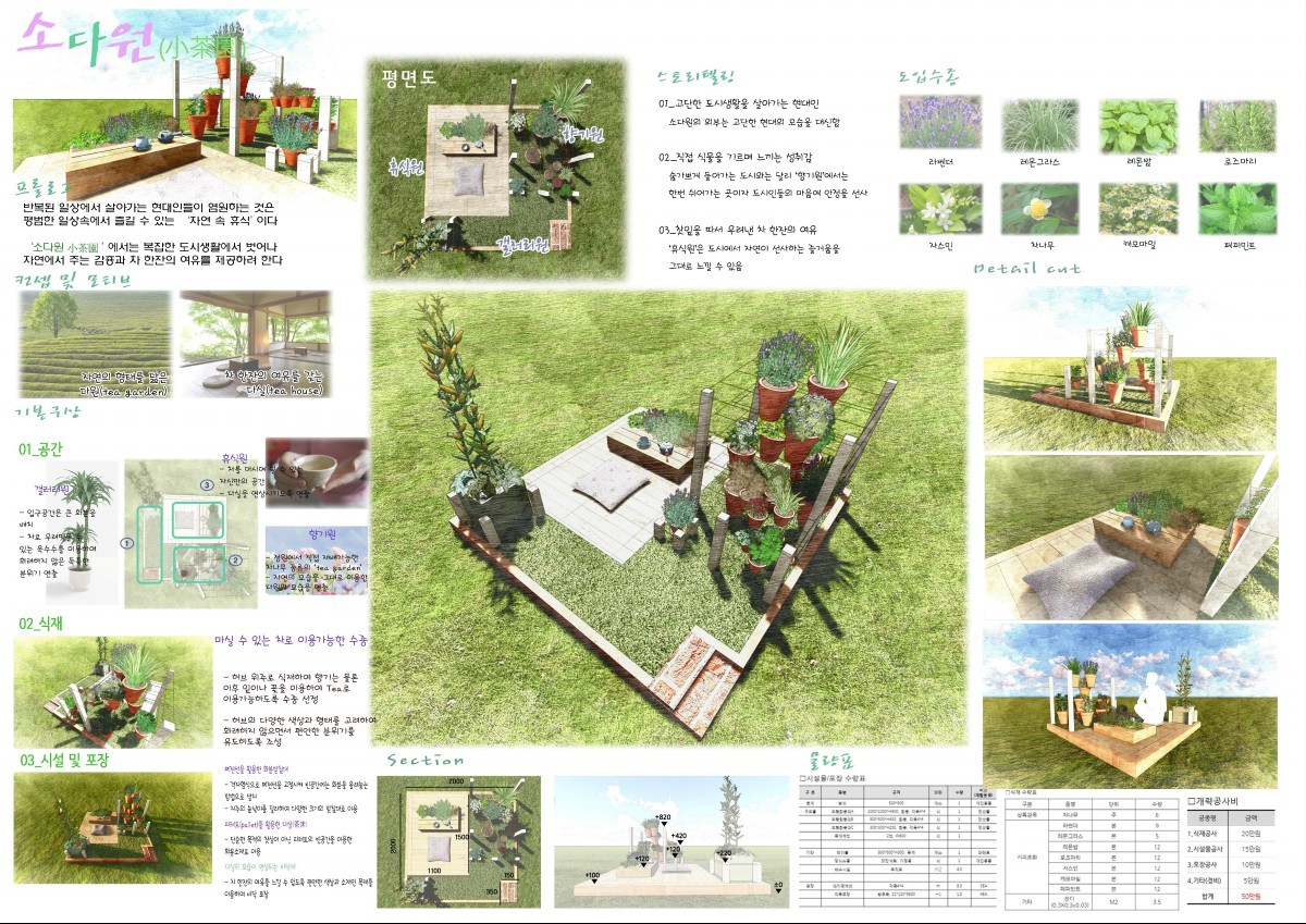 다실의 모습을 담은 소다원에서는 직접 기른 허브를 우려낸 차 한잔으로 바쁘게 살아가는 현대인들의 몸과 마음에 여유를 제공한다. 또한 허브의 향기를 품은 사색공간으로서의 소다원은 우리가 늘 바래왔던 공간이다.