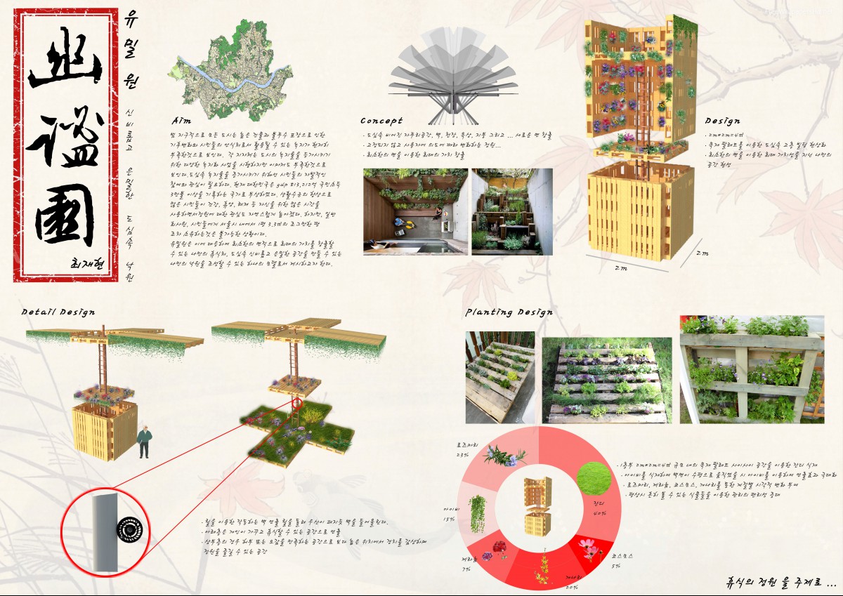 작품명 유밀원(幽謐園) 작가명 최재현 작품소개 도심속의 비어진 자투리공간,벽,옥상,지붕 그리고 새로운 면의 창출을 통해 고정되지 않고 사용자에 의도에 따라 변화하는 정원을 만들어 최소한의 면을 이용한 최대의 가치를 창출하고자 하였다. 작가명 최재현 (한양대학교 대학원 도시경관생태조경학과) 작품설명 도심속의 비어진 자투리공간,벽,옥상,지붕 그리고 새로운 면의 창출을 통해 고정되지 않고 사용자에 의도에 따라 변화하는 정원을 만들어 최소한의 면을 이용한 최대의 가치를 창출하고자 하였다. 최종완성 작품판넬