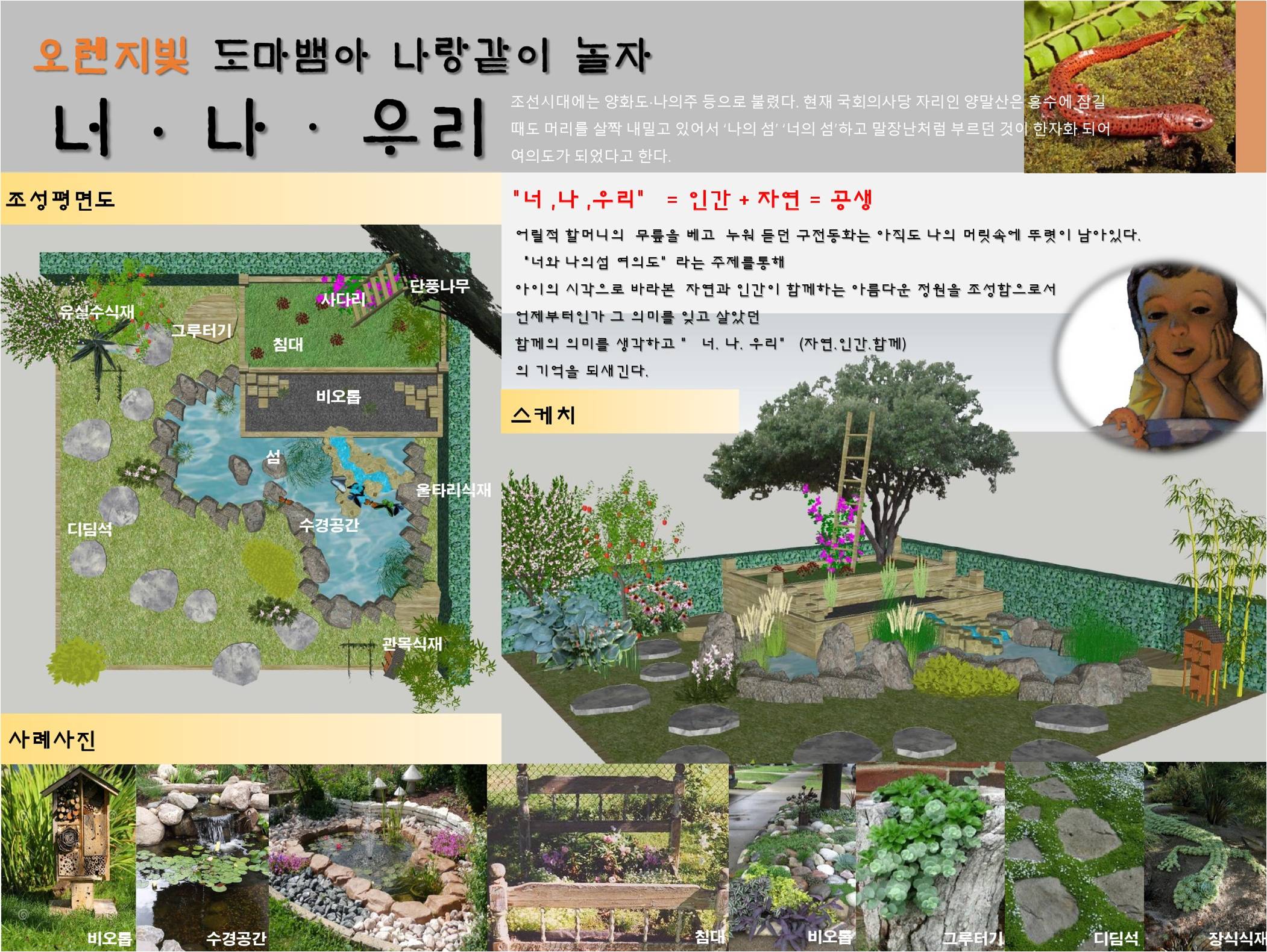 미래의 주인인 아이들의 시각으로 본 '자연과 인간의 공생'을 표현하고 '너, 나, 우리 (자연, 인간, 함께)의 의미를 되새긴다. "그런다고 하더라도...나무는 어떻게 키우려고?" "지붕을 열어 비와 햇살이 들어오게 하면 돼요. 그러면 침대 밑에선 고사리 같은 것도 자라고, 도마뱀들이 기어올라 다니는 나무 밑동 주위엔 커다랗고 하얀 버섯이랑 작은 별 모양의 이끼도 자랄 거예요.“