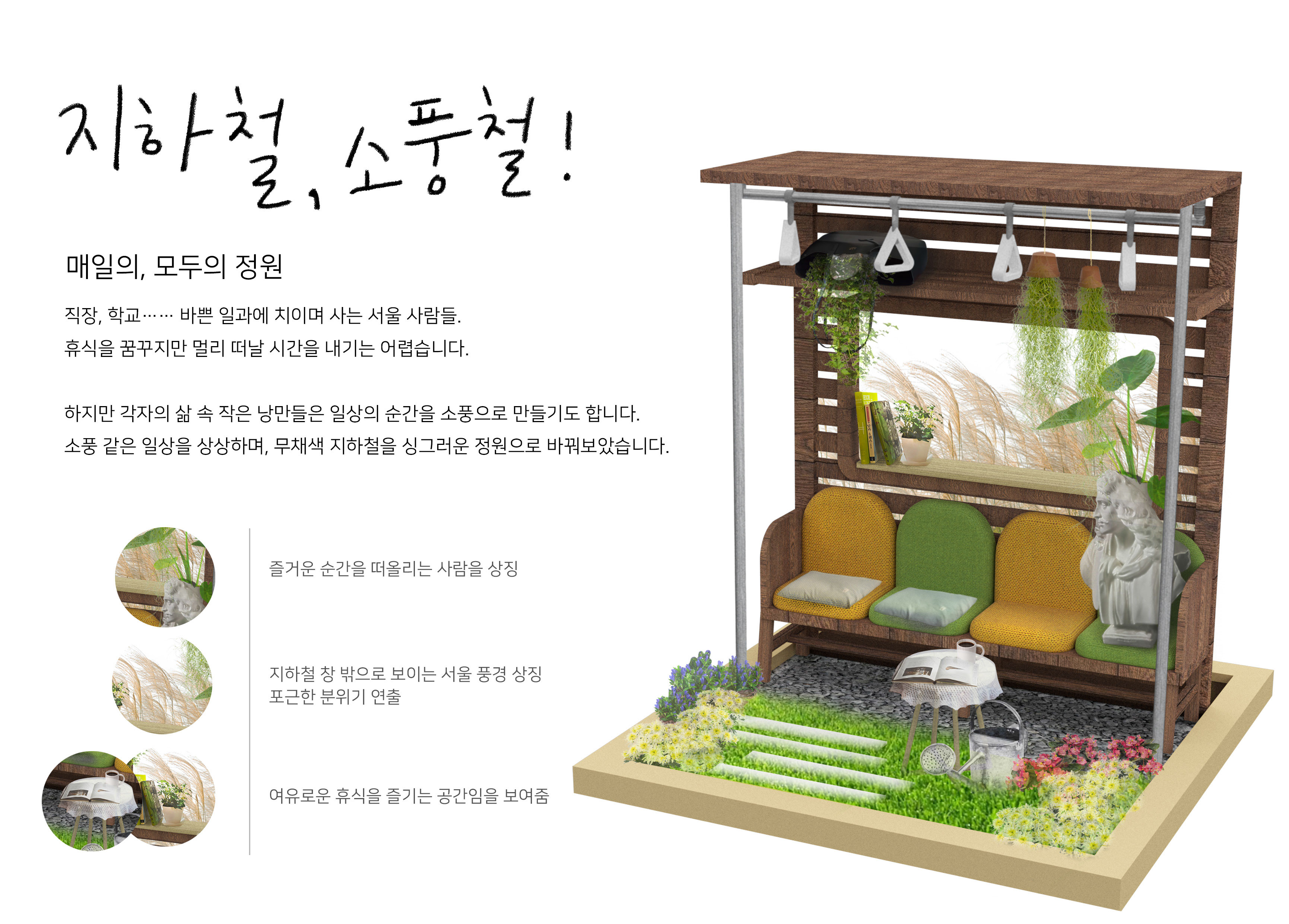 작품명 [은상]지하철, 소풍철! 작가명 작품소개 바쁜 일과에 치여 사는 서울 사람들. 휴식을 꿈꾸지만 멀리 떠날 시간을 내기는 어렵습니다. 하지만 각자의 삶 속 작은 낭만들은 일상의 순간을 소풍으로 만들기도 합니다. 소풍 같은 일상을 상상하며, 무채색 지하철을 싱그러운 정원으로 바꿔보았습니다. [팀명] 작가명 [윤빈딴스] 김윤빈 작품설명 바쁜 일과에 치여 사는 서울 사람들. 휴식을 꿈꾸지만 멀리 떠날 시간을 내기는 어렵습니다. 하지만 각자의 삶 속 작은 낭만들은 일상의 순간을 소풍으로 만들기도 합니다. 소풍 같은 일상을 상상하며, 무채색 지하철을 싱그러운 정원으로 바꿔보았습니다. 작품조성과정 최종완성 작품판넬