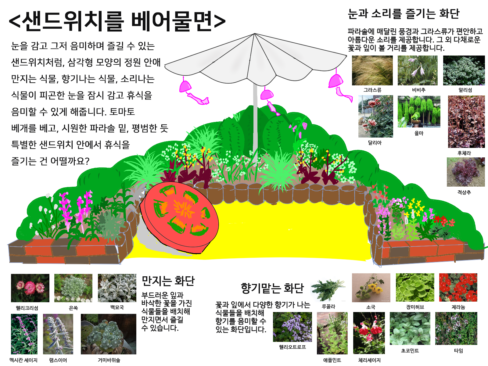 눈을 감고 그저 음미할 수 있는 샌드위치처럼, 삼각형 모양의 정원 안에 만지는 식물, 향기 나는 식물, 맑은 소리의 풍경이 피곤한 눈을 잠시 감고 휴식을 음미할 수 있는 공간을 만들어 냅니다. 평범한 듯 특별한 샌드위치 안에서 맛있는 휴식을 즐기는 건 어떨까요?