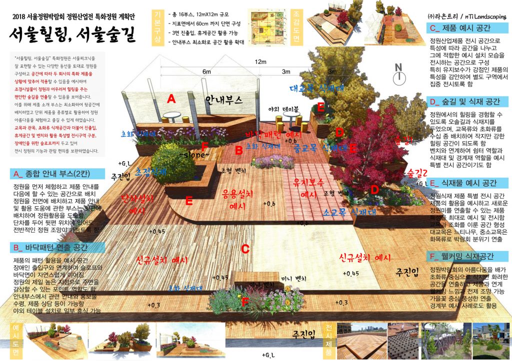 - 서울피크닉을 잘 표현할 수 있는 다양한 동선을 토대로 정원을 구성하고 공간에 따라 두 회사의 특화 제품을 상황에 맞추어 적용할 수 있음을 예시하여 조경시설물이 정원과 어우러져 힐링을 주는 편안한 숲길을 연출할 수 있음을 보여줍니다.