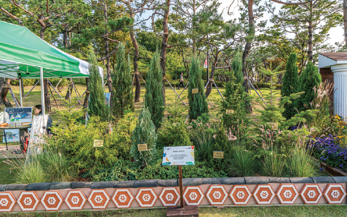 외국인이 한 데 모여사는 삶의 장소를 표현하고자 초록이 다 같은 초록색이 아니라 여러 색깔의 녹색이 있듯이 다양한 초록색의 상록교목 정원으로 다채로운 삶의 장소를 상징화함