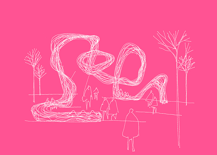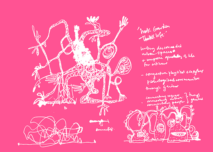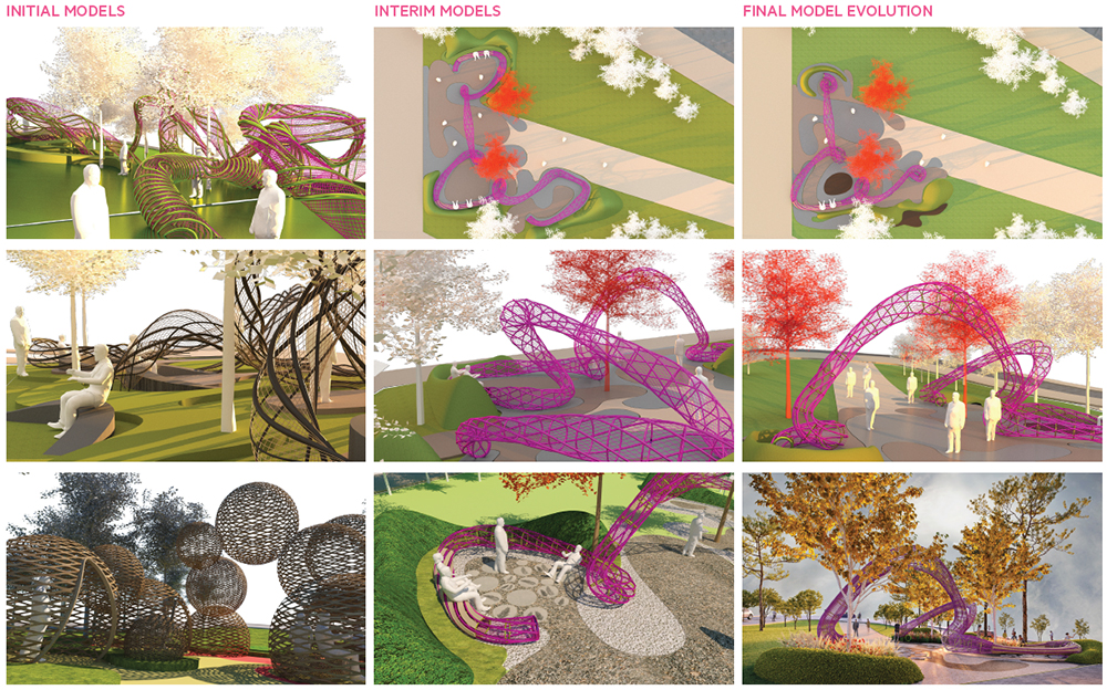 The Vine’s Web takes its inspiration from the fungi networks seen in nature; a symbiotic relationship in which mycorrhizal associations help plants with water and nutrients while the fungi provides food in the form of carbohydrates. These fungi networks connect plants that may be widely separated. The vine reinterprets that theme as the indivisible connection between humans and nature and between cities and its garden network. The structure rises from the ground morphing in section and functionality, embracing the plants and developing a holistic and cohesive landscape art work. The magenta tones in the vine are a splash of colour against the monotone background, the arches and the pockets spaces are areas to enjoy and immerse in the garden.