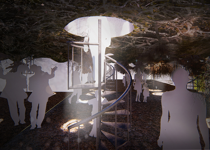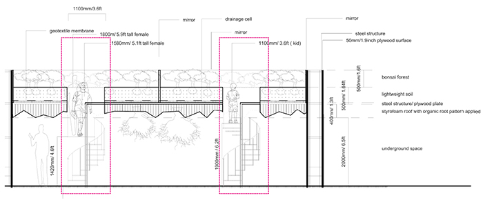Climate change is a key fight in our generation, attention to these global issues. For us play a major role in capturing carbon dioxide in plants’ biomass, some of which is then sequestered in the soils through capturing waters in their canopies and root system. This underground is a showcase of tree-fungi mutualism, a reminder of the collaboration or entanglement that exists beneath the ground and makes forest work. Above all, the trees provide recreation and improve the quality of life for cities and inhabitants. The bonsai species in the room are selected to culturally and ecologically related to the Seoul’s forests. Each room represents one season. Viewers walk into the installation from the main entrance. Exposed tree roots and hanging rhizomes from the ceiling in the dark room is accompanied by the smell of earth in this mysterious underground world. When you take the spiral stair cases to climb up and look through the peephole, the forests at eye levels be viewing, they will observe the endless bonsai forests surrounding them and panoramically with their beautiful poetic sculptural forms. By gazing at the trees from the below, viewers feel as if they are in the world of giants, enjoy contemplate and recall the feeling of walking in a forest, and relax psychologically.
