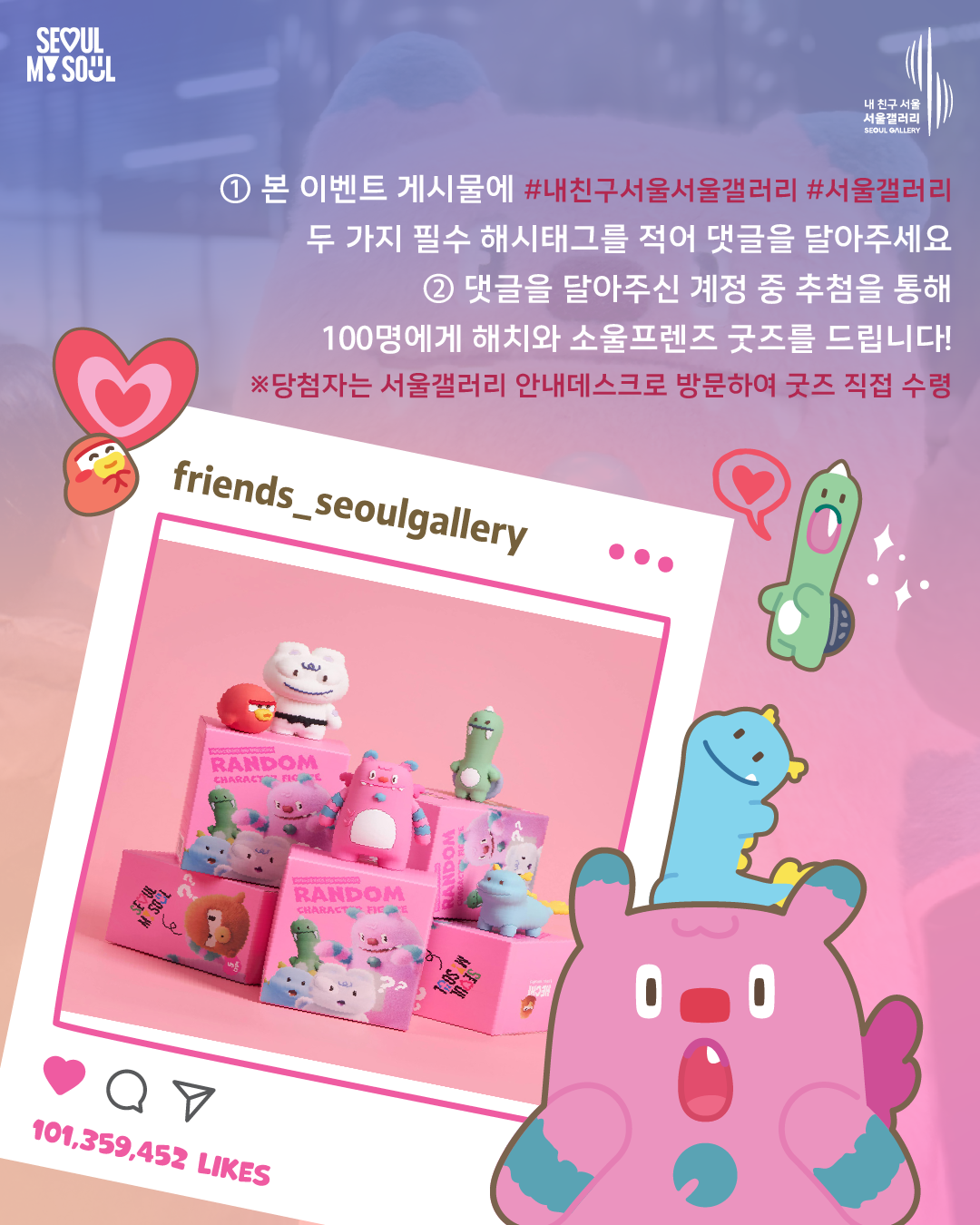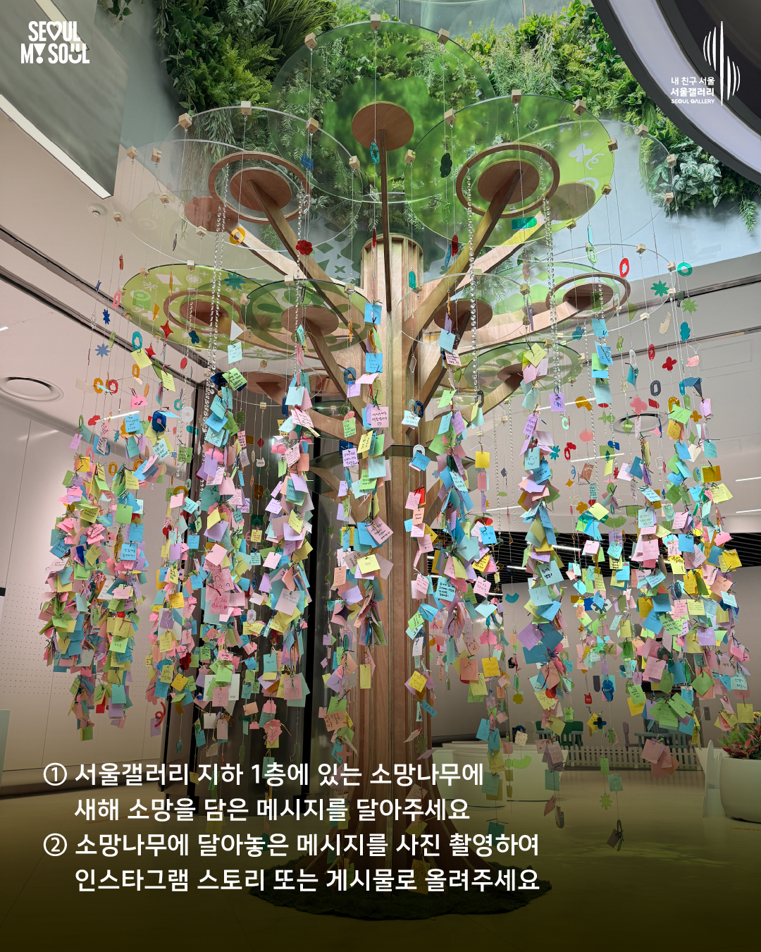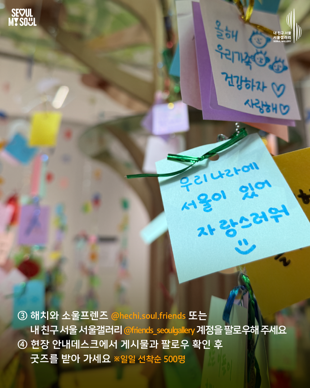 방문객 여러분의 새해 소망을 응원하며 서울마이소울·해치 굿즈를 증정하는 특별한 이벤트도 진행합니다. 소망나무에 메시지를 달고 인스타그램 업로드 후 해치와소울프렌즈 또는 서울갤러리 계정 팔로우 시 안내데스크에서 서울라면을 받을 수 있고(행사 기간 일일 선착순 500개), 댓글 이벤트를 통해 총 100명에게 해치 굿즈도 드리니 많은 참여 부탁드립니다.