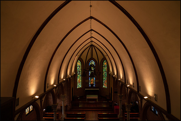 가장 돋보이는 것은 채광. 제대 뒤쪽으로 3개의 스테인드글라스가 있는데,